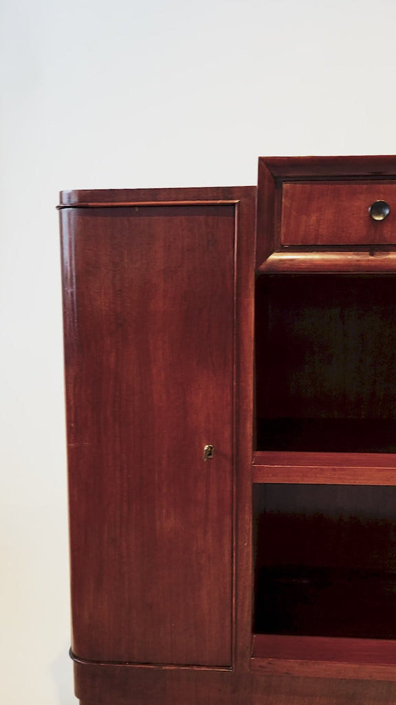This unique Italian Art Deco walnut wood sideboard or bookcase credenza is circa 1940. The cabinet is beautifully handcrafted and features a simple, elegantly-proportioned design with clean lines and gentle curves. The center section features four dovetailed drawers with original solid wood round knobs over open shelving with one fixed shelf, flanked on either side by two locking side doors with elegant rounded edges opening on storage with one adjustable and removable shelf each. This lovely and versatile cabinet can be used as a sideboard or credenza, bookcase, bar cabinet, storage cabinet, media console, etc. The perfect showpiece for home or office. From the collection of Samuel Botero and Emery Von Sztankoczy. Botero was an A-list interior designer and tastemaker.