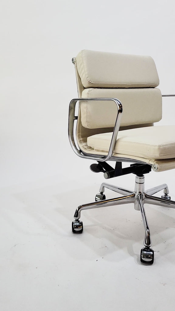 This authentic Eames for Herman Miller Soft Pad Management height office chair from the Aluminum Group Collection was manufactured in the 2000s. This classic mid century modern office chair was first designed in 1958 by Charles and Ray Eames and continues to be produced today by Herman Miller. This exclusive pairing features premium 100% vegan leather from designer fabric house Schumacher. Schumacher’s vegan leather line offers an eco-conscious alternative with a supple hand that’s as good as the real thing. This high-performance luxury fabric is ultradurable, easily cleaned and stain resistant. This chair is in a beautiful shade of cream and features a polished aluminum five-star swivel base, armrests and rolling casters. The comfortable and ergonomic soft pad design features thick, plush cushions and a 360 degree smooth swivel seat with manual lift adjustable height and backrest tilt. An iconic and collectible desk chair perfect for home or office.
