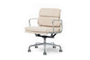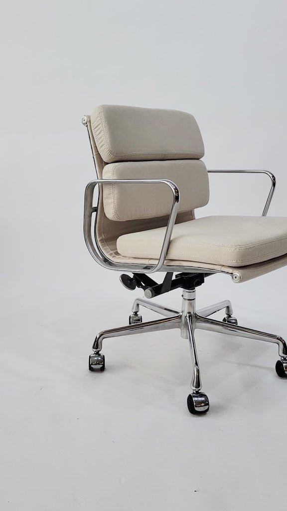 This authentic Eames for Herman Miller Soft Pad Management height office chair from the Aluminum Group Collection was manufactured in the 2000s. This classic mid century modern office chair was first designed in 1958 by Charles and Ray Eames and continues to be produced today by Herman Miller. This exclusive pairing features premium 100% vegan suede in "Birch" from designer fabric house Schumacher. Schumacher’s vegan suede line offers an eco-conscious alternative with a supple hand that feels and appears like genuine suede. This high-performance luxury fabric is ultradurable, easily cleaned and stain resistant. This chair is in a beautiful shade of cream and features a polished aluminum five-star swivel base, armrests and rolling casters. The comfortable and ergonomic soft pad design features thick, plush cushions and a 360 degree smooth swivel seat with manual lift adjustable height and backrest tilt. An iconic and collectible desk chair perfect for home or office.