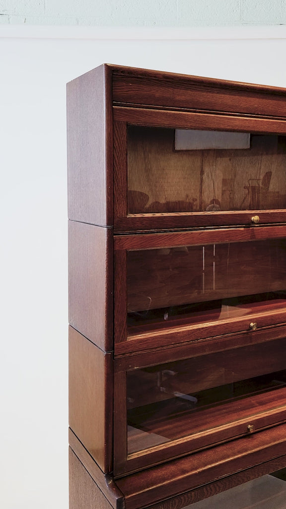 This tall antique English mission style five-stack wooden lawyer or barrister bookcase cabinet is from the early 1900s. Expertly handcrafted from rift sawn white oak wood, this tall, modular bookshelf has a unique format with three smaller stepback upper shelves over two larger lower shelves. Four cabinet shelves feature wood-framed glass doors and one with wooden panel door all with original metal knobs that open by pulling up and sliding back using a patented lift and recess closure mechanism. This bookcase disassembles into seven individual pieces including separate top and block foot base. Apparently unlabeled but with English construction detailing.
