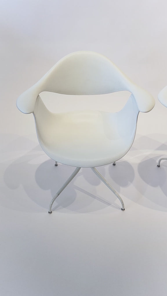 This classic mid century modern white “Swag” chair was designed by George Nelson in 1958 and produced by Herman Miller circa 2010. The iconic mid century design features clean lines and elegant, sculptural curves. The swag leg chair design by the office of George Nelson was developed in response to his desire to create a chair with a beautiful "swagged" leg (one that tapers while it curves). The contemporary version of the chair produced by Herman Miller has a seat made from molded polypropylene and 16-gauge steel legs with adjustable glides. This chair features white seat and white legs.